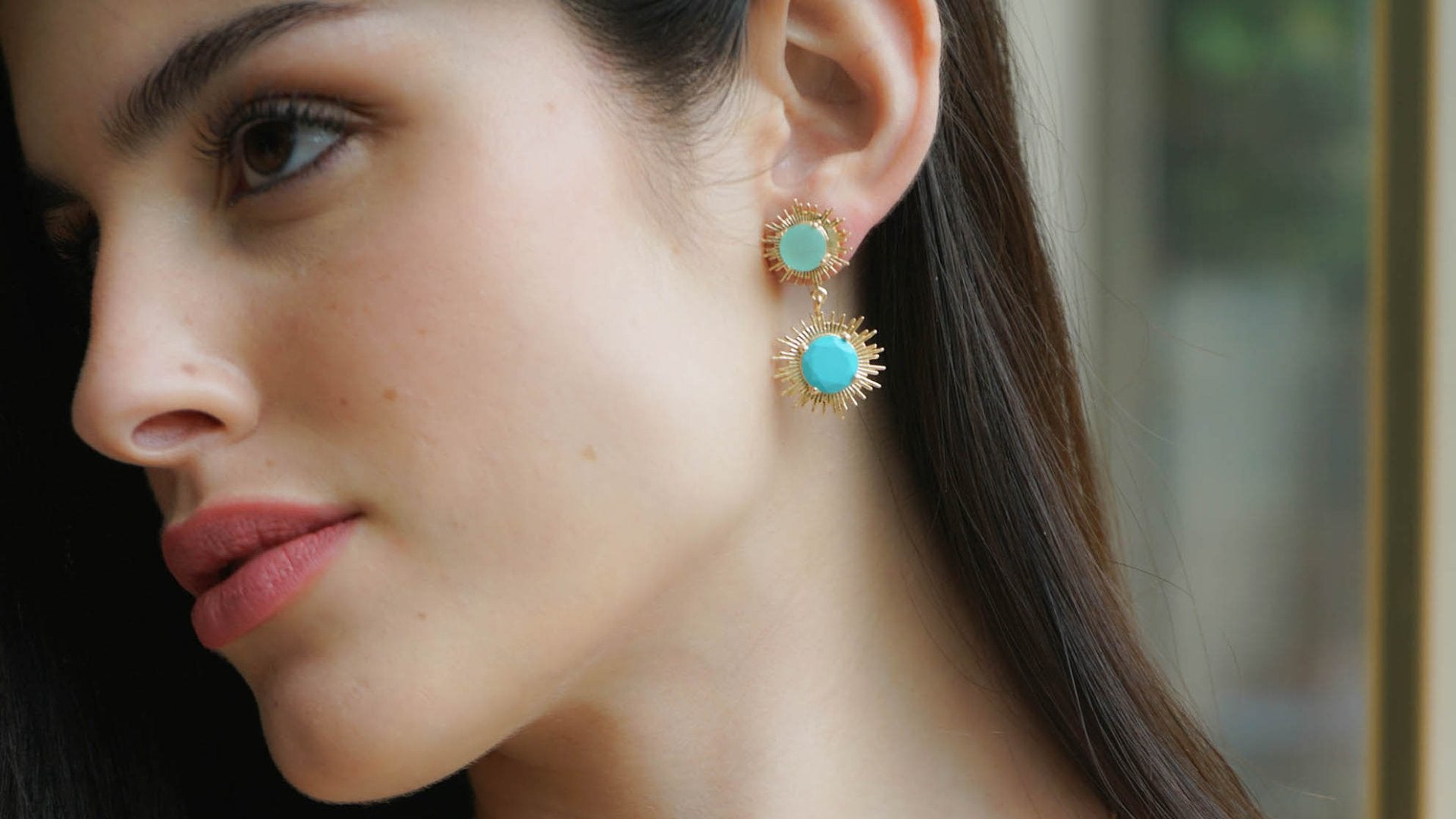 14KT Gold Plated with Chalcedony and Turquoise. Length - 1.4 inches , Width- 0.7 inches. Due to the unique features of natural stones,Slight color variation may occur.