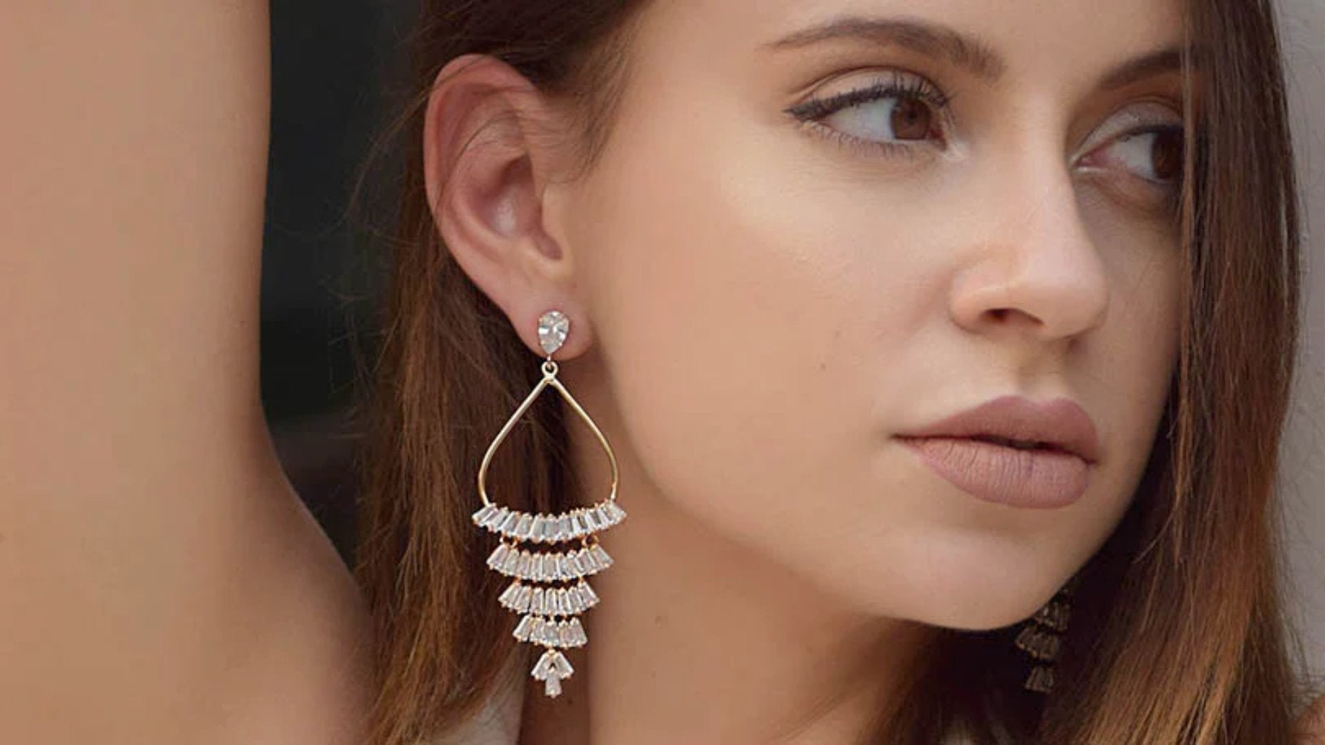 14 Kt Gold Plated with Zirconia. Measurement: Length 3 inches, Width 1.30 inches. Due to the unique features of natural stones, slight color variation may occur.
