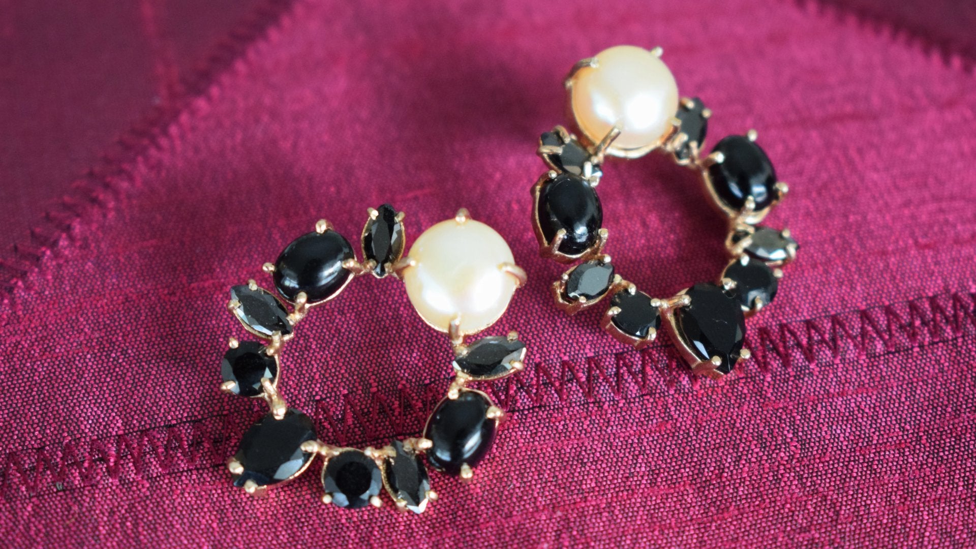 14 Kt Gold Plated with Black Onyx & Pearl. Due to the unique features of natural stones, slight color variation may occur. Measurement: Length 1.3 inches, Width 1.02 inches.