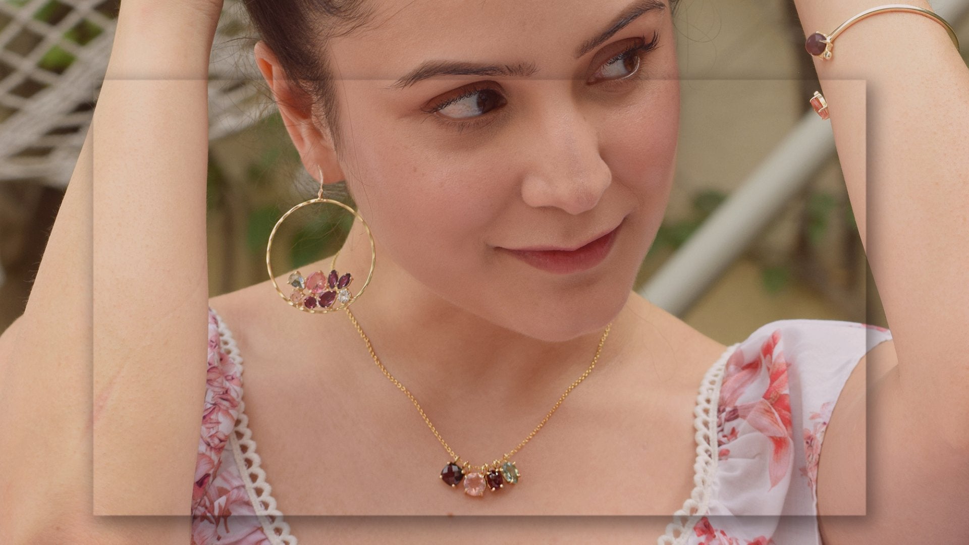 14 Kt gold plated with Garnet, Green Quartz, Natural Crystal Rose Doublet, and Zirconia. Due to the unique features of natural stones, slight color variation may occur.